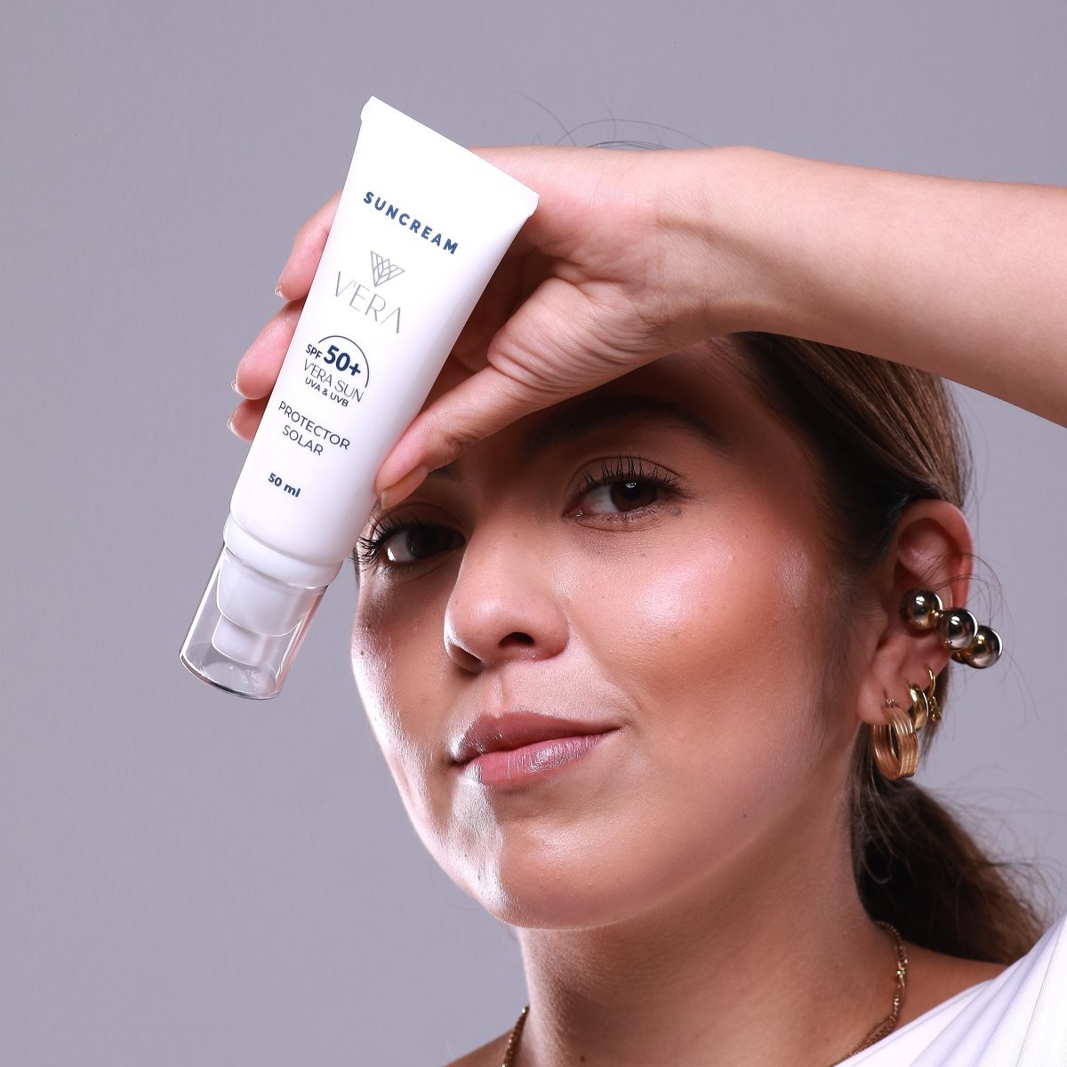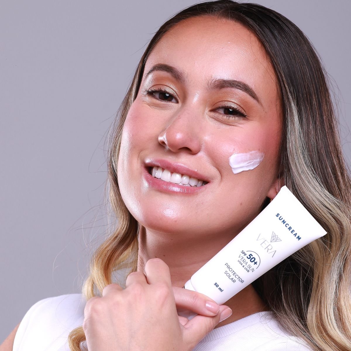 El Protector Solar VERA SPF 50+ ofrece una protección avanzada contra los rayos UV, combinando ingredientes que hidratan y cuidan la piel. Su fórmula no grasa y de rápida absorción proporciona un acabado mate, ideal para pieles grasas y mixtas, además de ofrecer un efecto tensor que mejora la apariencia de la piel al instante.